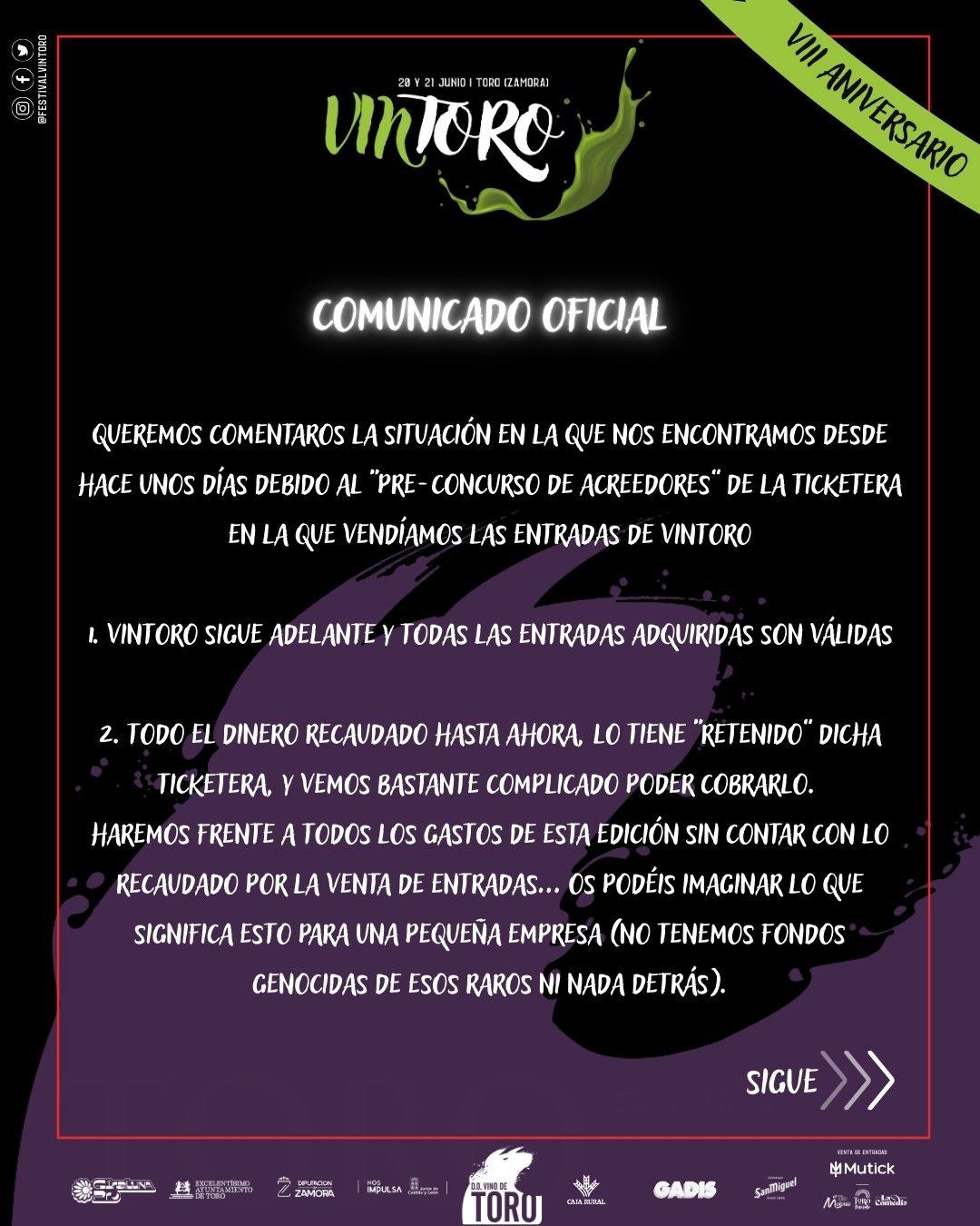 La organización del festival VINTORO se ha visto en la obligación de realizar un comunicado oficial, para anunciar que tras los sucedidos con la empresa que gestionaba sus entradas, ellos siguen adelante con su festival y piden todo nuestro apoyo, ya que ellos se van a encargar de los gastos de esta nueva edición: